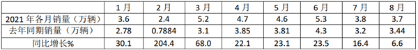 根据中汽协数据,2021年8月份,大中轻客车销售3.7万辆,环比下降0.9%,同比增长6.6%;2021年 1-8月大中轻客车累计销售33.3万辆,累计同比增长32%,增幅比1-7月(1-7月同比增幅36.2%)收窄了4.2个百分点。现将2021年8月及1-8月大中轻客车销量特点做扼要分析。