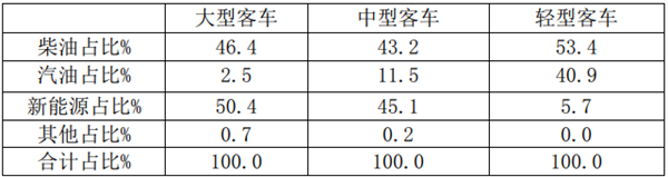 由上表可知,新能源在大型客车中占比最高(主要还是新能源大型公交多),次高是在中型客车中;在轻型客车占比最小;柴油类在轻型客车中占比最高,其次是在中型客车中;汽油类主要是在轻型客车中占比较高,其次是在中型客车中(主要是一些前置的中型商务接待车型,如7米丰田考斯特、宇通T7等)。