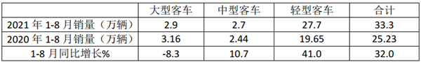 2021年1-8月客车累计销售33.3万辆,同比增长32%;其中大型客车累计销量2.9万辆,累计同比下降8.3%,是客车市场中累计同比唯一下降的细分车型;中型客车累计销量2.7万辆,累计同比增长10.7%,但跑输客车大盘增幅21.3个百分点;轻型客车累计销量27.7万辆,同比增长41%,跑赢客车大盘增幅9.0个百分点,也是拉动2021年前8月客车市场增长的唯一动力。