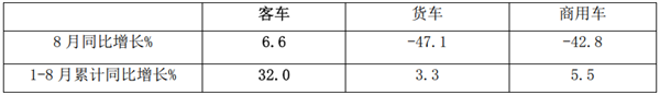 上表显示,今年8月客车销量同比增幅6.6%,跑赢8月商用车大盘(-42.8%);今年1-8月客车累计同比增长32%,也跑赢1-8月商用车大盘(5.5%)。也就是说无论是今年8月还是1-8月,客车均领涨商用车市场,成为商用车市场中最得力的细分市场。