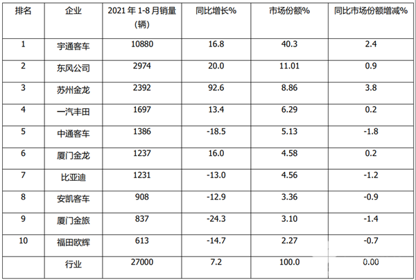 上表可见,在2021年1-8月中型客车销量top10中: