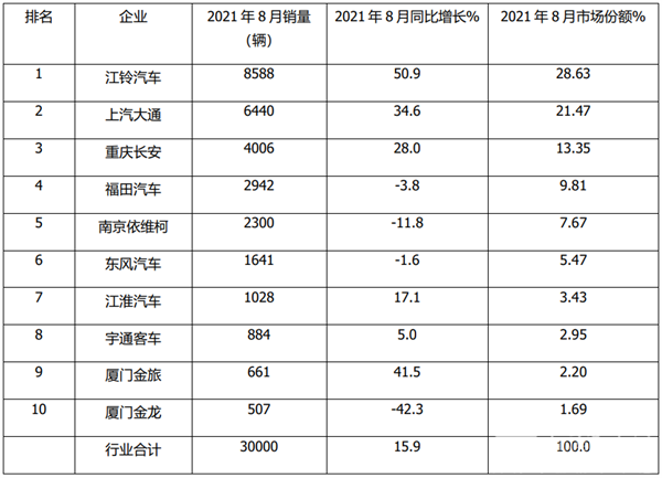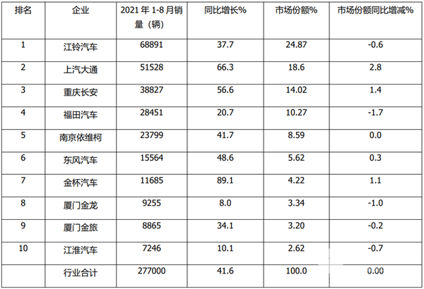 江铃汽车位居榜首;上汽大通位居第二;重庆长安位居第三; 宇通首次杀入前8名;TOP10销量同比6增4降,江铃汽车增幅最大 ----2021年8月轻型客车主流企业销量榜单