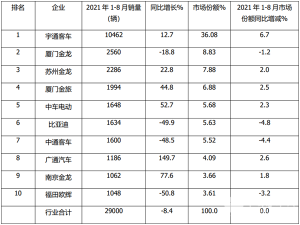上表显示,2021年1-8月TOP10大型客车累计销量、同比及份额变化:
