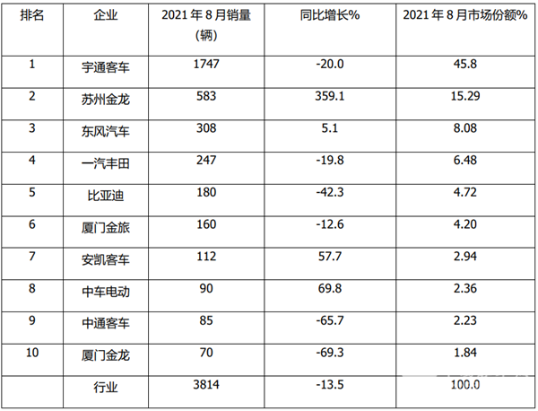 根据中汽协数据,2021年8月中型客车销量排行: