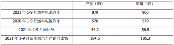 根据中汽协数据,2021年9月燃料电池汽车产销同比统计: