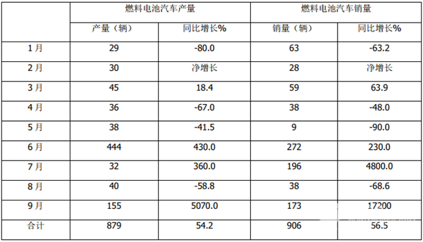 根据中汽协数据,2021年1-9月各月燃料电池汽车产销统计: