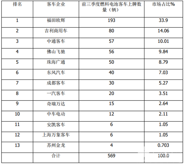 其余客车企业上牌数量均在50辆以下。另外从上表还可看出今年前三季度共有13个客车企业发生了燃料电池客车终端实际销售。