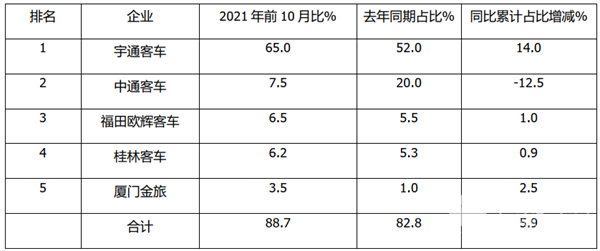 上表可见,2021年前10月校车销量TOP5企业校车竞争呈现的特征是: