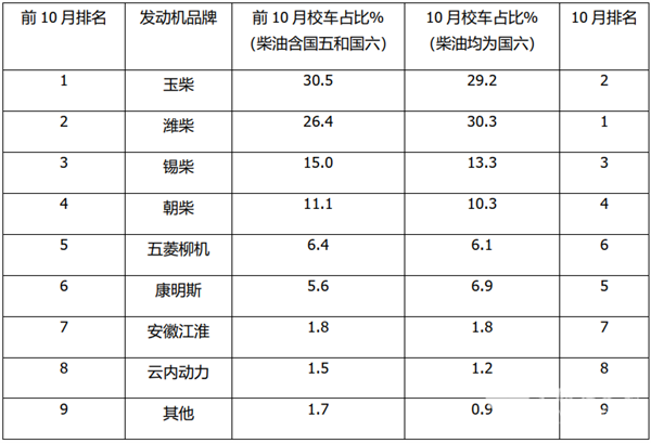 根据终端上牌信息,按校车发动机动力品牌划分,2021年10月及前10月校车销量结构统计: