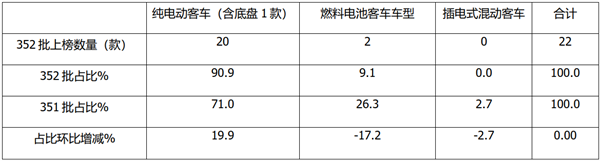 在第352批公告中,按技术路线划分,纯电动客车(含底盘2款)上榜车型20款,占比90.9%,占据绝对的主导地位,且占比环比增加19.9个百分点,是占比环比增加最多的车型;说明纯电动的主体地位在进一步增强;