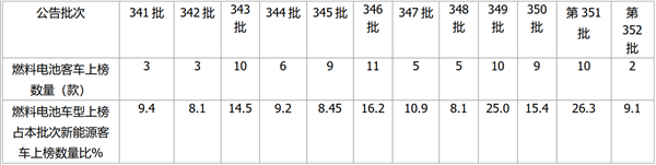 上表说明,燃料电池客车在近期工信部发布的公告中,占比忽高忽低,波动较大,其中第351批占比为最高,而352批上榜的燃料电池(352批是近来燃料电池客车车型上榜数量最少的一个批次)占比忽然减低到9.1%,占比环比下降了17.2个百分点,降幅较大,这主要可能与目前燃料电池客车具体补贴政策不明、车企心理没底有关。