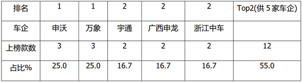 上表可见,在第352批公告上榜的前5家车企中,上海申沃和上海万象均上榜3款,并列第一;而宇通客车、广西申龙客车、浙江中车均上榜2款,并列第二。TOP2(前5家车企)累计上榜12款车型,占比55%,其余10家车企均只上榜1款车型。