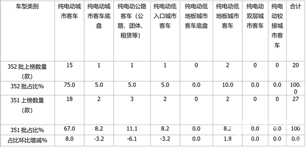 根据第352批公告数据,按目标用途划分上榜的20款纯电动客车车型类别结构占比及占比环比增减统计: