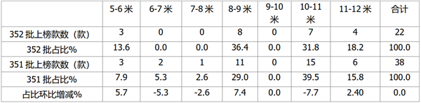 根据第352批上榜车型数据统计,各长度段上榜车型数量及占比:
