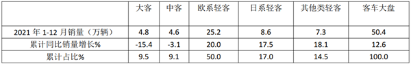 2、从占比看,欧系轻客占据了客车大盘的份额为50%,居于客车市场中的绝对霸主地位;是推动2021年客车市场累计增长的主要力量。