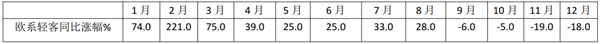 根据中汽协数据,2021年1-12月各月欧系轻客销量同比增幅: