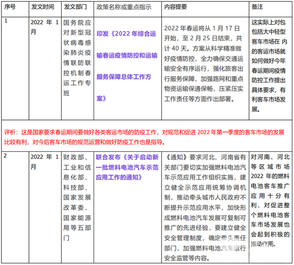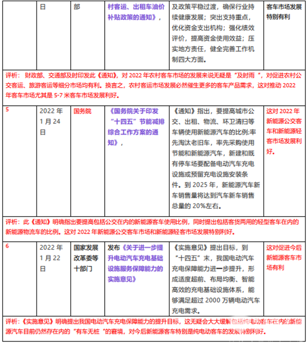 众所周知,客车作为汽车领域的小众市场,主要是作为生产资料的商用车形式存在,其市场发展不但与国家经济大环境有关联,而且与国家出台的各项政策也密不可分,从一定程度上说,客车市场就是政策市场,国家相关政策仍然是引导今后客车市场发展的重要风向标,特别是新能源客车和智能网联客车。为此,特将2022年1月国家层面有关客车发展的主要政策进行汇总,并进行扼要评析,供行业参考。具体如下表: