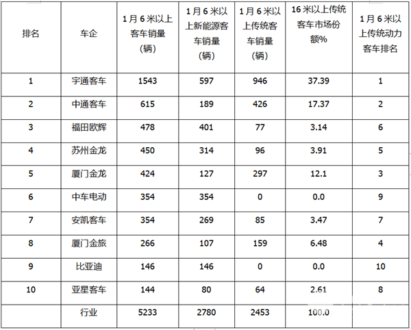 上表显示 ,在今年1月6米以上的大中型客车市场竞争格局中,新能源客车和传统客车有较大差异。但“两通三龙”始终位居前列,特别是在今年1月6米以上传统动力的大中型客车市场,“两通三龙”更是显示了强悍的市场竞争力,具体特征是: