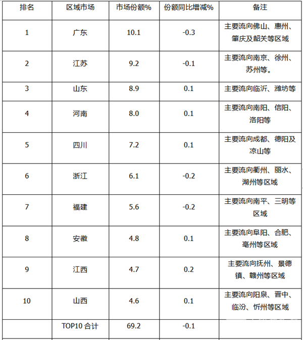 特点三、广东、江苏、山东、河南、四川是6米以上传统动力客车的主力市场,top10累计占比近7成,且同比市场集中度下降0.1%