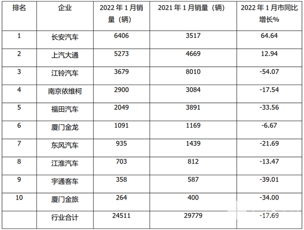 2022年1月主流轻客车企销量排名(数据来源:中汽协)