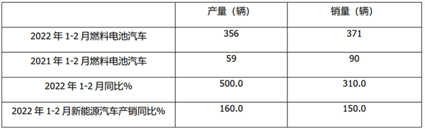 根据中汽协数据,2022年1-2月燃料电池汽车累计产销及同比统计: