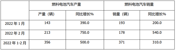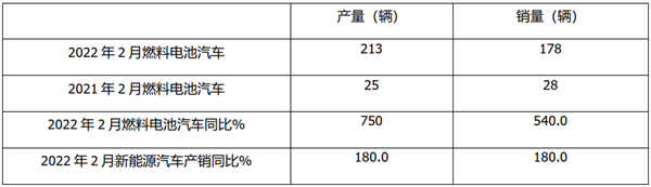 根据中汽协数据,2022年2月燃料电池汽车产销同比统计: