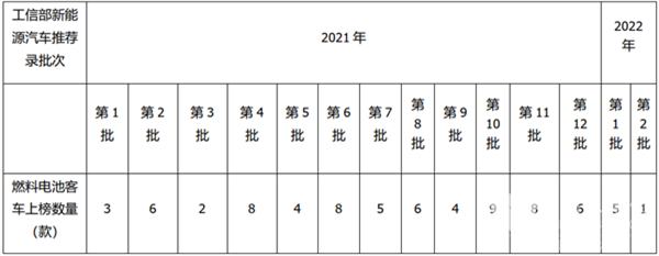 根据工信部数据,截止目前2021年-2022年3月累计发布的14批新能源客车推荐目录中燃料电池客车上榜车型数量统计: