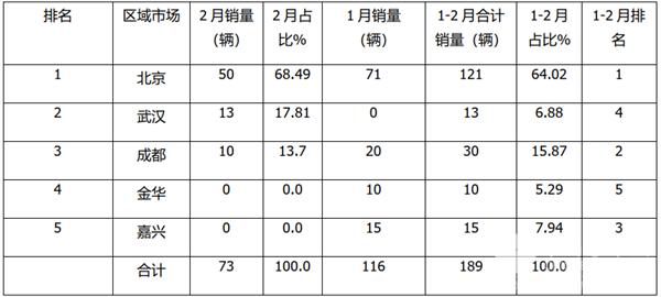上表可见,在2022年2月燃料电池客车实际终端市场销量中,北京销售50辆,占比68.49%,可谓一家独大;其次是武汉销售13辆,占比17.81%;再次是成都销售10辆,占比13.7%;