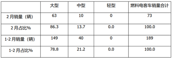 上表显示,在今年2月的燃料电池客车销量结构中,大型客车销量占比86.3%,居于绝对的主体地位;在今年1-2月燃料电池客车销量结构中,大型客车累计销售占比78.8%,也居于绝对的主体地位。也就是说,无论是今年2月还是1-2月,大型燃料电池客车均占据绝对的主体地位。这可能与补贴政策向重载、大功率倾斜有关。