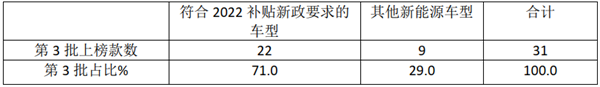 上表可见,在2022年第3批新能源客车推荐目录中,符合2022年新能源汽车补贴新政要求的为22款车型,占比71%,为此次新能源客车推荐目录上榜车型中的绝对主体。