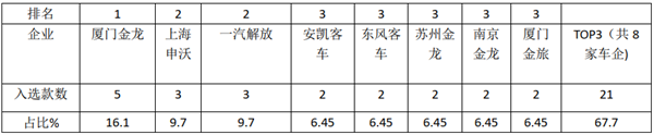 厦门金龙客车上榜5款,位居第一,占比16.1%;申沃客车、一汽解放客车2家车企均上榜3款,占比均为9.7%,并列位居第二;安凯客车、东风客车、厦门金旅、南京金龙均上榜2款,占比均为6.45%,并列第三;TOP3(8家车企)累计上榜21款,占比67.7%。其余10家车企车企均上榜1款,占比均为3.2%。