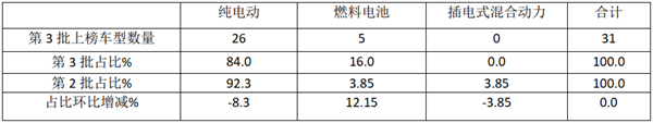 三、燃料电池占比环比增加最多——纯电动上榜26款,占比84%,占比环比下降最多,燃料电池上榜5款,占比为16%,占比环比增加12.15%