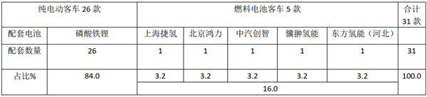 纯电动客车入选车型26款,占比84%,占据老大地位,但占比环比减少8.3个百分点。主要是因为纯电动客车技术相对较成熟、可以实现零排放,且完全可以摆脱对燃油的依赖,运营成本相对低廉,节能减排效果明显,是新能源公交客车和公路客车推广应用的主力车型。燃料电池上榜5款车型,占比16%,环比占比增加12.15%,是占比环比增加最多的车型。具体是,上榜车企及车型如下: