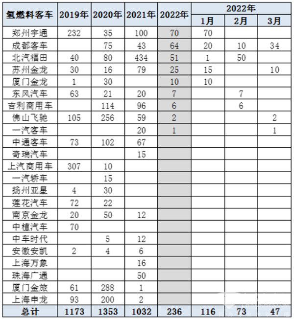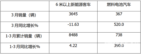 上表显示,2022年3月燃料电池汽车同比增520%,跑赢2022年3月6米以上新能源客车-11.63%的增幅近531.63个百分点;2022年前3月燃料电池汽车累计同比增长390%,跑赢1-3月大中型新能源客车4.22%的增幅近385.78个百分点。可见,无论是今年3月还是1-3月,燃料电池汽车同比增速都远远大于新能源客车市场。