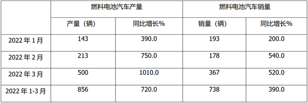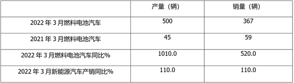 根据中汽协数据,2022年3月燃料电池汽车产销同比统计: