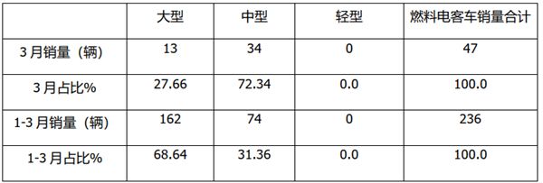 特点七、1-3月燃料电池大型客车居于主体地位;3月中型燃料电池居于主体地位