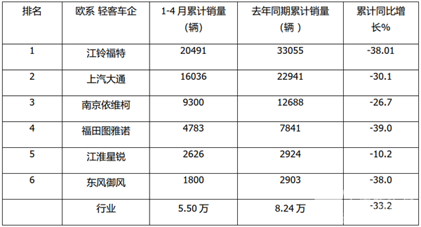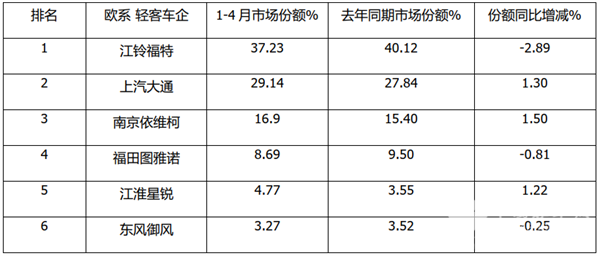 1-4月欧系轻客累计销量排行:江铃居榜首,大通第二、南京依维柯第三,主流车企累计同比全部下降