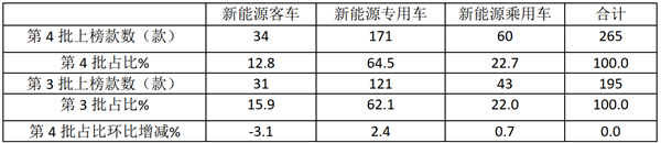 上表可见,在2022年第4批新能源汽车推荐目录入选车型中,新能源客车上榜34车型,占比12.8%,比占比最多的新能源专用车少近51.7个百分点, 比占比第二的新能源乘用车占比少近10个百分点,居于最小,且占比环比减少3.1个百分点,是占比环比减少最大的细分车型。