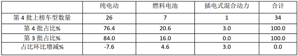 根据2022年第4批《目录》数据统计,在26款入选的新能源客车车型中,按技术路线划分,各车型占比及占比环比增减如下: