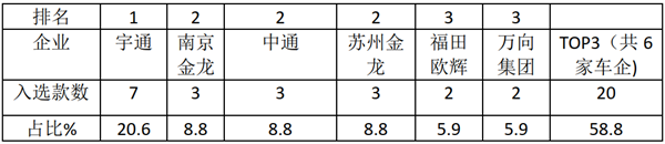 四、宇通客车上榜7款,居榜首;南京金龙、中通客车、苏州金龙均上榜3款并列第二