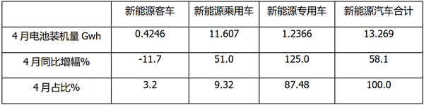 特点一、4月我国新能客车动力电池装机量在新能源汽车各细分市场中同比增幅最小,是新能源汽车中同比唯一下降、最“不给力”的细分市场;占比也最小