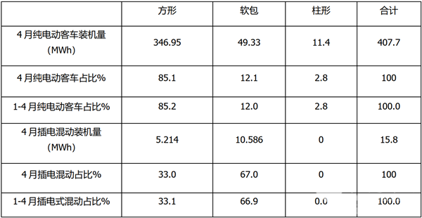 纯电动客车中,无论是4月还是1-4月,方形电池装机量都是最大,占比达到85%左右;其次是软包型占比12%左右,最小的是柱形占比不到3%。