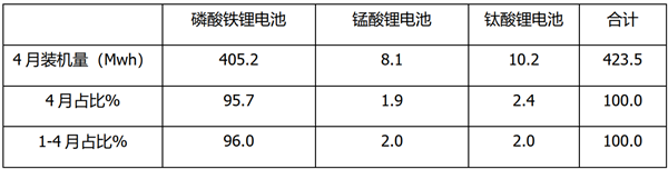 上表可见,在2022年4月及1-4月新能源新能源客车装机量中,磷酸铁锂电池占比分别为95.7%和96%,均占据绝对主体地位,其次是锰酸占比分别1.9%和2.0%,再次是钛酸锂占比分别为2.4%和2.0%(主要是格力钛新能源客车装机)。
