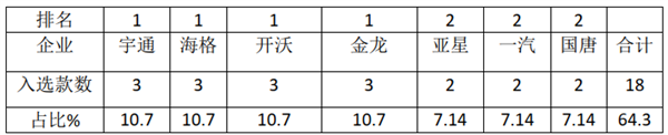---亚星、一汽、国唐客车3家车企均上榜2款,占比均为7,14%,并列位居第二;