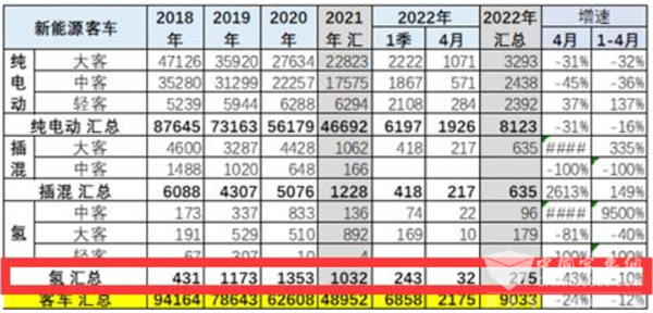 一是之前燃料电池客车上榜的车型较多,而真正实现终端销售的并不多 。中国汽车流通协会数据显示,今年前4月燃料电池客车终端市场实际销售只有275辆,同比下滑10%(见下截图),车企为了避免资源浪费,而暂时停止了对燃料电池客车的申报。