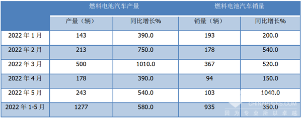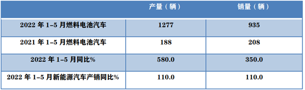 根据中汽协数据,2022年1-5月燃料电池汽车累计产销及同比统计: