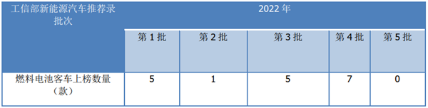 据工信部数据,截止目前2022年累计发布的5批新能源客车推荐目录中燃料电池客车上榜车型数量统计: