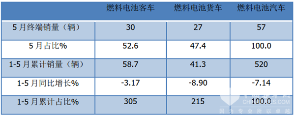 上表显示,无论是今年5月还是1-5月,燃料电池客车占据燃料电池汽车的市场份额均大于燃料电池货车。换言之,燃料电池客车都是燃料电池汽车市场的主体部分。