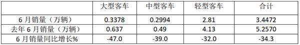1、今年6月客车总销量为3.4万辆,同比下降34.3%;