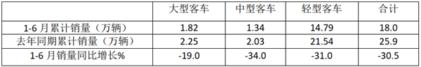 1、今年1-6月客车总销量为18万辆,累计同比下降30.5%;